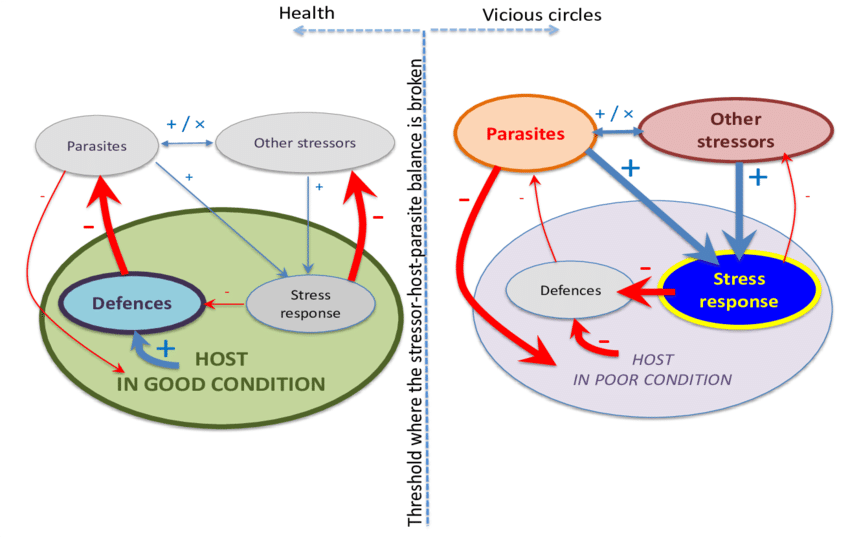(A) Destructive parasite. They cause worst disease in host. They produced toxic substance in host. They kill the Host. e.g (B) Balanced parasite. These are so adopted in their demands upon the host that host is able to supply the needs of parasite and continuous to live it self.